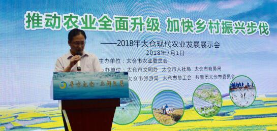 市农委主任盛海峰为本次现代农业展示会致辞;太仓市农委、市文明办、人社局、商务局、旅游局、总工会、团市委共同为“田园风”微信公众号和“田园风”APP正式上线按下启动球,启动“田园风”正式上线运行;市农委副主任邹翔宣读我市农产品质量安全市倡议书。